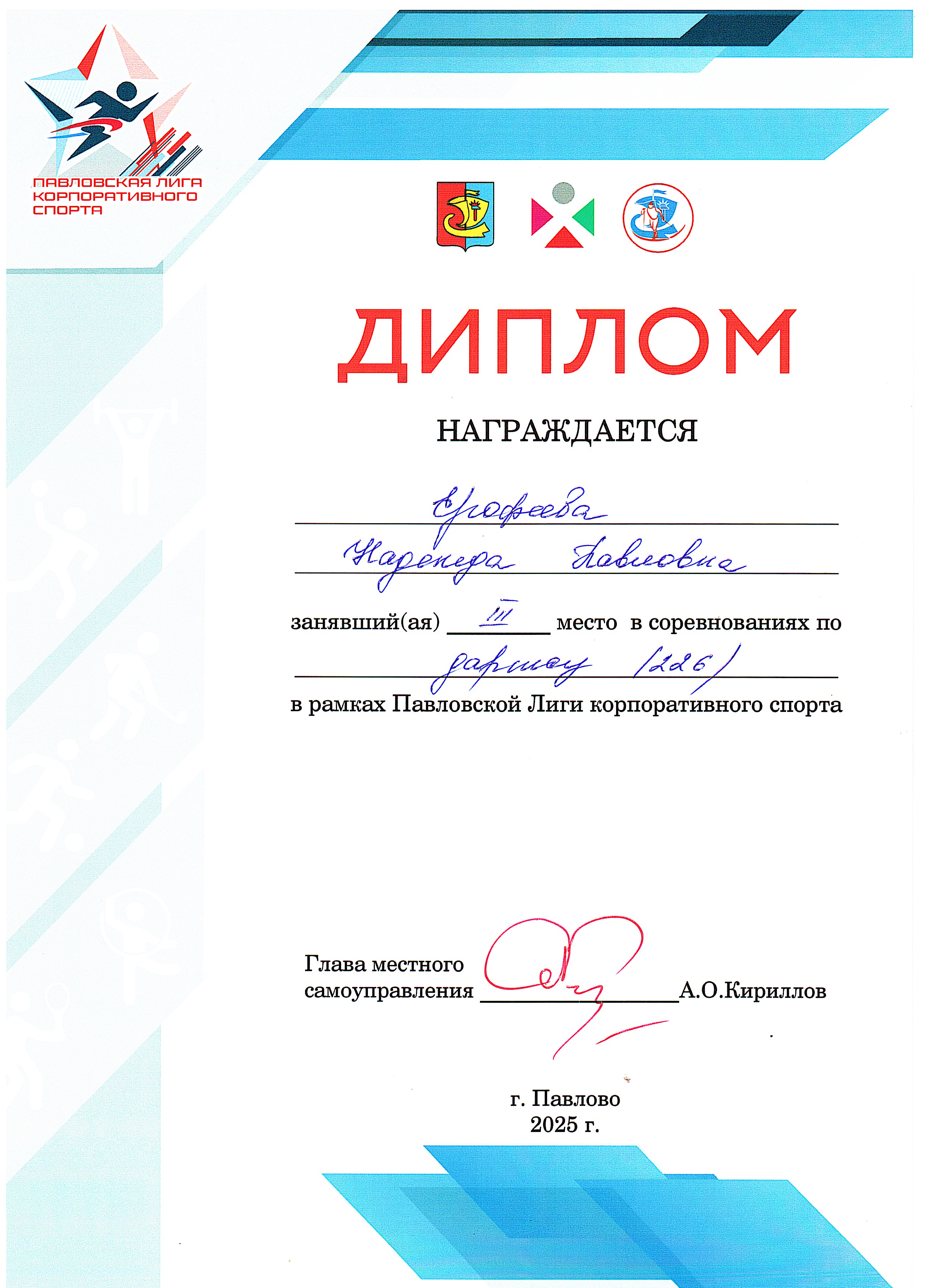 26 октября 2025 года стартовала Павловская Лига корпоративного спорта в ГАОУ ДО НО СШ ФОК «Звезда». В этот день соревновались 8 команд, которые продемонстрировали сплочённость, выдержку, меткость и точность броска - команда АО «Гидроагрегат», АО «ПМЗ «Восход», ООО «Павловский автобусный завод», Управление образования администрации Павловского муниципального района, «Мао Бизнес - инкубатор Павловский», ООО птицефабрика «Павловская», Павловская центральная районная больница, ООО «Кот». Соревнования проводились по упражнению «Набор очков» и победитель определялся по лучшему результату участников среди мужчин и женщин. Первое место среди команд заняла команда АО «ПМЗ «Восход», 2 - ой стала команда Управления образования администрации Павловского муниципального района. Среди женщин учитель - логопед Ерофеева Н.П. заняла 3 место.