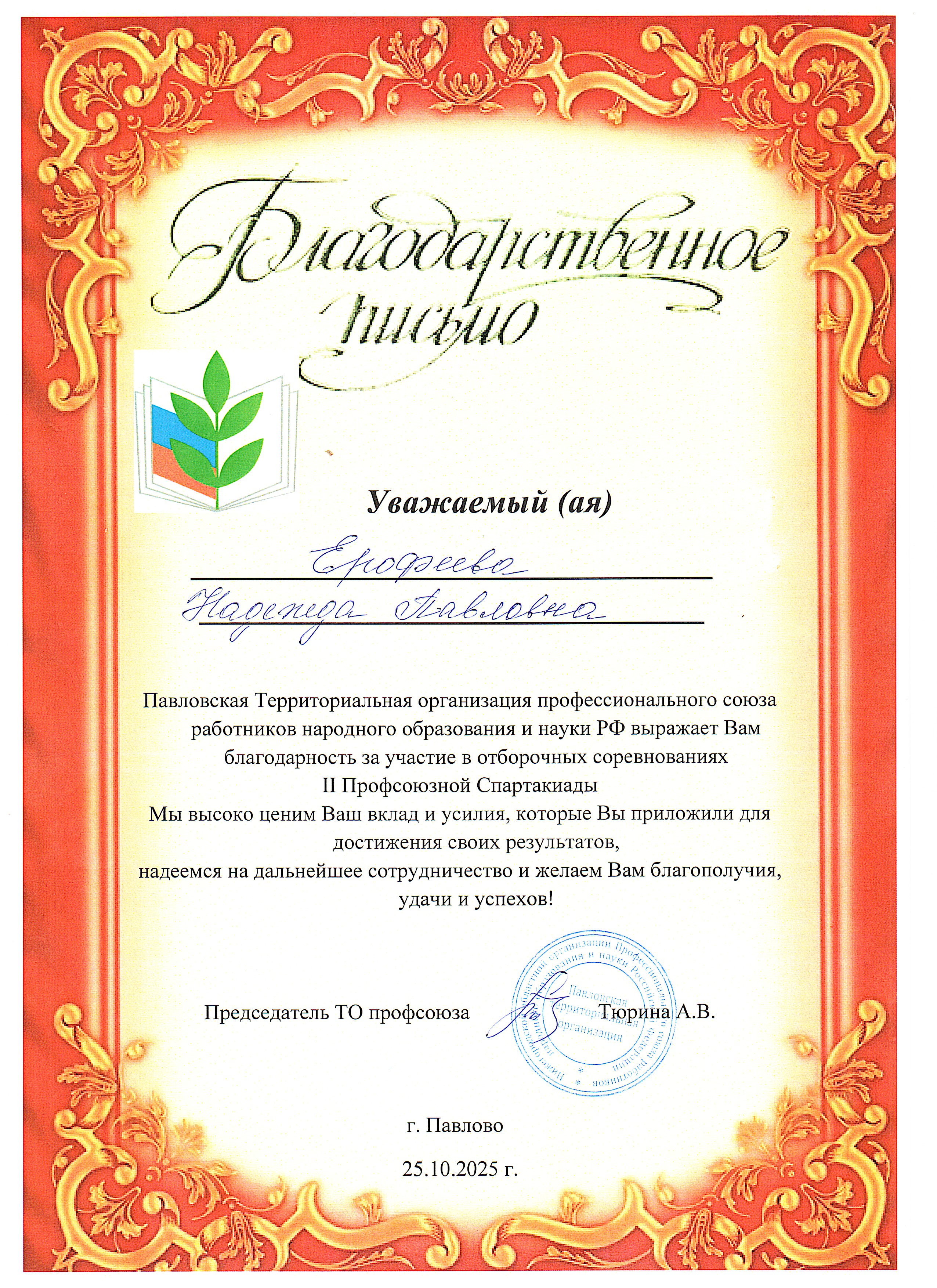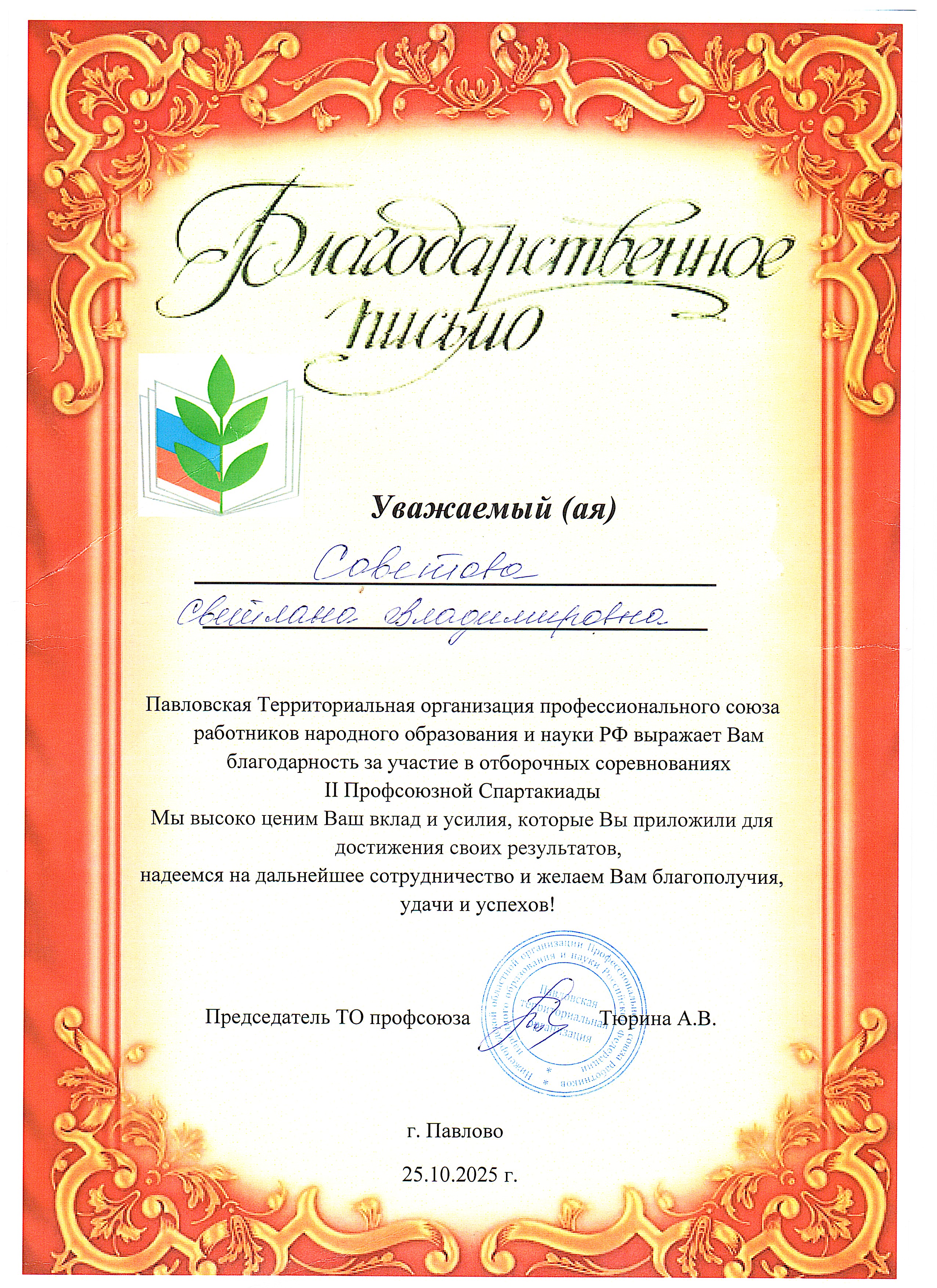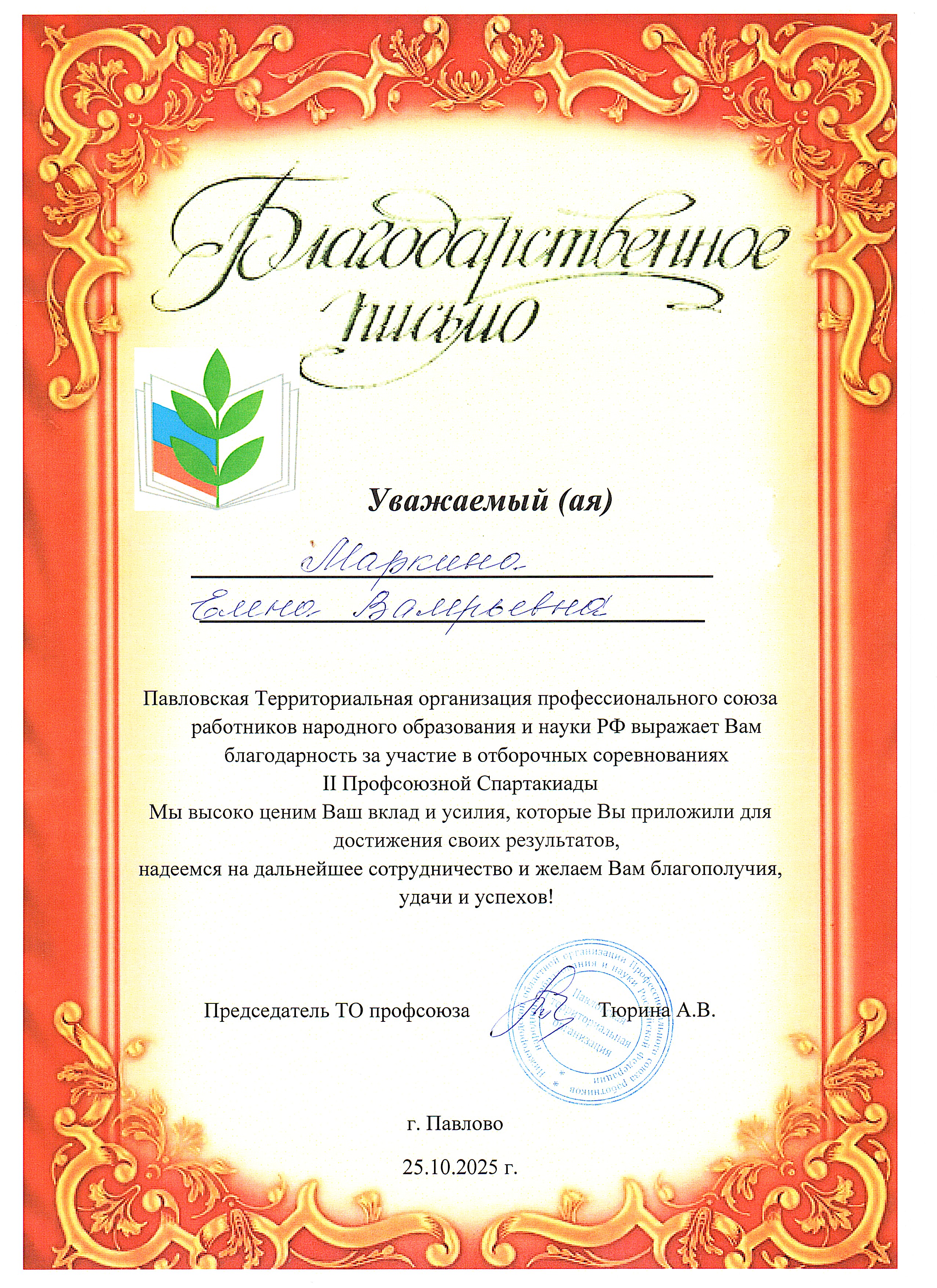 25 октября 2025 года в Павловской территориальной организации профсоюза образования прошли соревнования отборочного тура II областной профсоюзной спартакиады. Принявшие в ней участие педагоги МАДОУ детского сада №25 «Сувенир»- воспитатели Советова С.В. и Маркина Е.В., учитель - логопед Ерофеева Н.П., были награждены Благодарственными письмами. Соревнования проходили на базе ДЮСШ «Спартак» г.Павлово. Участники состязались по следующим видам спорта: дартс, настольный теннис, волейбол. Соревнования были очень эмоциональными, позитивными, педагоги - члены профсоюза провели время в дружественной обстановке.